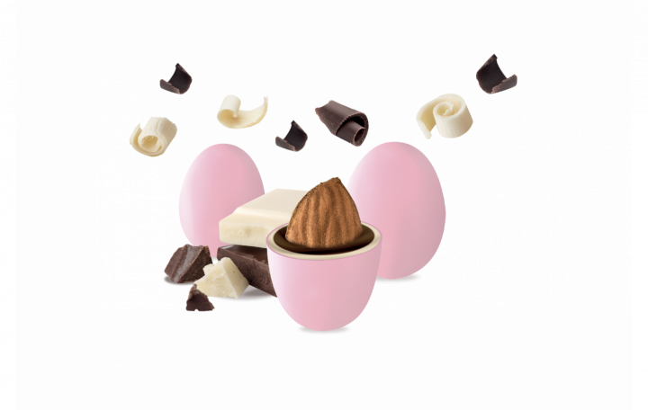 Mandorla tostata ricoperta da cioccolato fondente e bianco e da un sottile strato di zucchero.