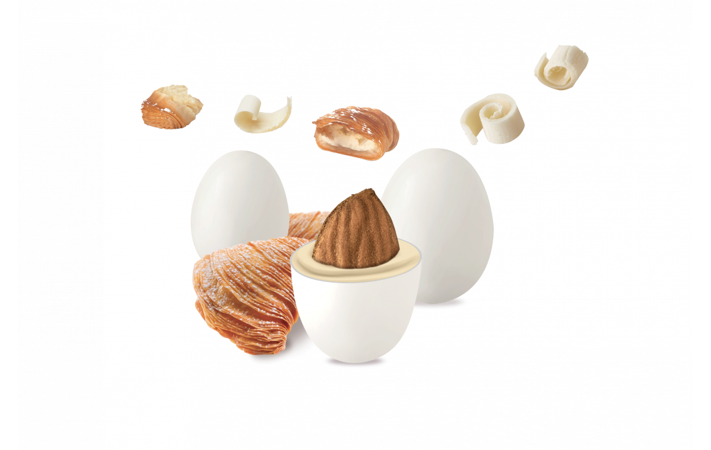 Mandorla tostata ricoperta da cioccolato bianco al gusto di sfogliatella napoletana e da un sottile strato di zucchero.